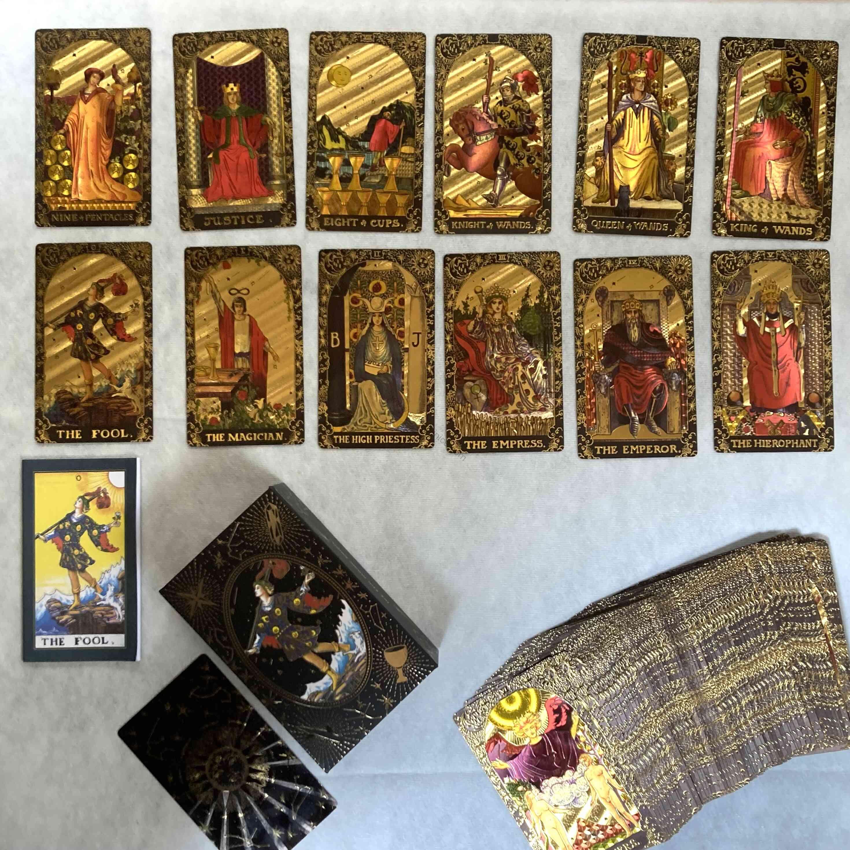 A striking blend of tradition and elegance, this Gold Foil Tarot Set is designed for those who appreciate fine craftsmanship and mysticism. Housed in a luxurious gift box, this set includes a beautiful tarot deck, a detailed guidebook, and premium packaging that makes it perfect for gifting or retail displays.